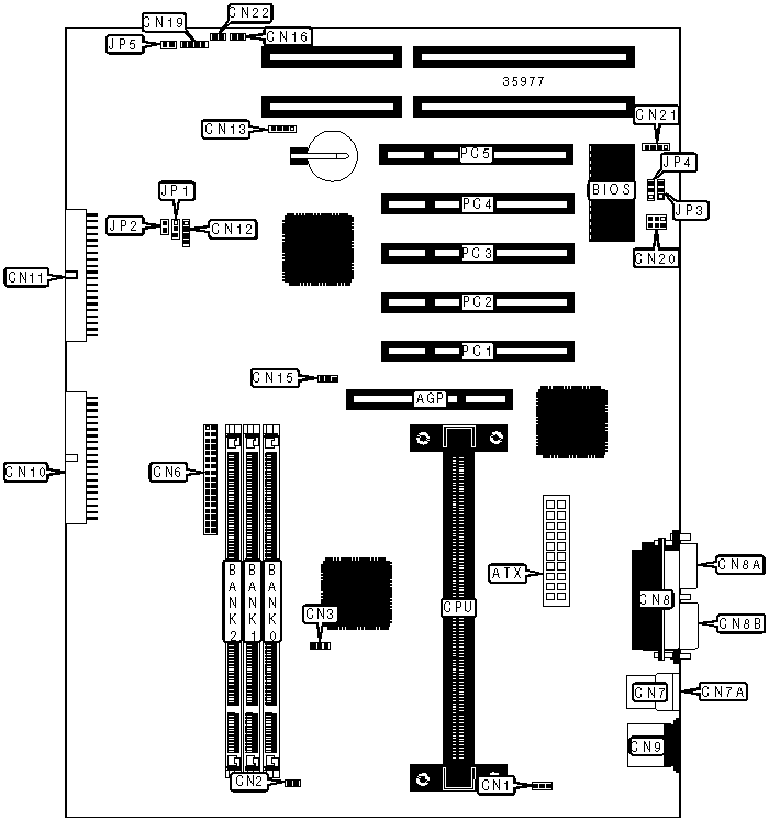 32-bit PCI slots (5), floppy drive interface, IDE interfaces (2), parallel port, PS/2 mouse port, serial ports (2), USB connectors (2), ATX power connector, AGP slot |