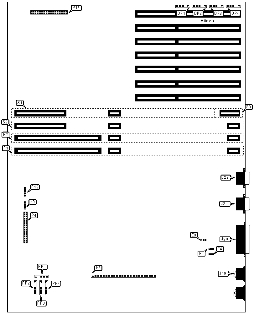 System processor card slot, system processor card/Proprietary expansion card slot, 32-bit system memory card, 32-bit external memory card, VGA port, parallel port, serial port, bus mouse port, IDE interface, floppy drive interface