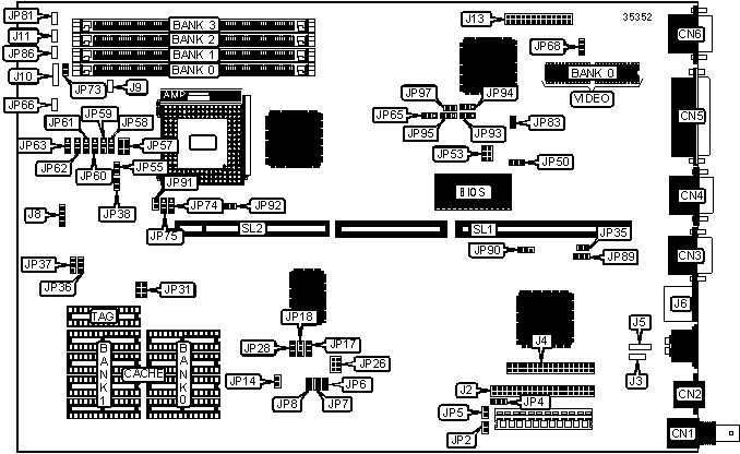 32-bit VESA local bus slot, Ethernet BNC connector, Ethernet RJ-45 connector, Ethernet AUI connector, floppy drive interface, IDE interface, parallel port, PS/2 mouse port, serial ports (2), VGA feature connector, VGA port, riser slot |