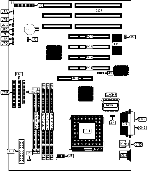 32-bit PCI slots (4), floppy drive interface, IDE interfaces (2), parallel port, PS/2 mouse port, serial ports (2), IR connector, USB connectors (2), ATX power connector, AGP slot |