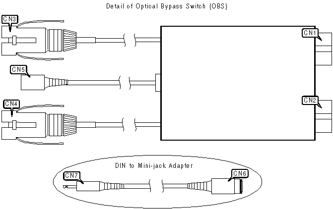 Note: Type A (Phy A) or Type B (Phy B) connectors are designated by a labeled key in the side of the male MIC. CN1 and CN3 are keyed for A type connectors, and CN2 and CN4 are keyed for B type connectors. The Dual Attachment Station - MIC version of the 4811 E/FDDI Adapter also requires an adapter cable (see "DIN to Mini-jack Adapter" in above diagram) in order to properly connect the Optical Bypass Switch. | |||