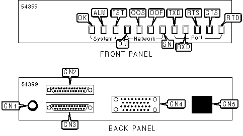 DTE/DCE ports (2), network interface via RJ-48, power jack, DTE port