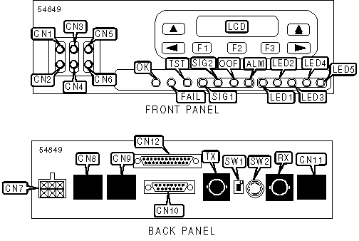 BNC connectors (2), auxiliary port (RJ-48), communication port (RJ-48), HDSL network interface via RJ-48 connector, test jacks (6), power jack,