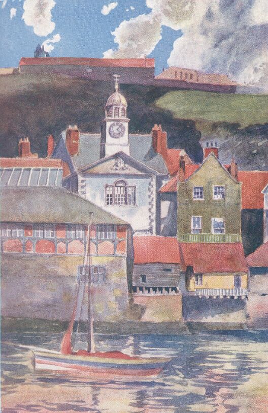 The average artist is a being who is quite unable to recognise architectural merit. He sees everything to please him if the background of his group be sufficiently tumble-down and derelict. If this be incorrect, how could such swarms of artistic folk paint and actually lodge in Staithes? The steep road leading past the station drops down into the village, giving a glimpse of the beck crossed by its ramshackle wooden foot-bridge—the view one has been prepared for by guide-books and picture postcards. Lower down you enter the village street. Here the smell of fish comes out to greet you, and one would forgive the place this overflowing welcome if one were not so shocked at the dismal aspect of the houses on either side of the way. Many are of comparatively recent origin, others are quite new, and a few—a very few—are old; but none have any architectural pretensions or any claims to picturesqueness, and only a few have the neat and respectable look one is accustomed to expect after seeing Robin Hood's Bay.