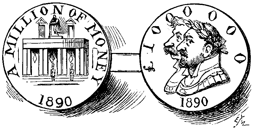 A Million of Money, "a new military, sporting, and spectacular Drama," is a marvel of stage management. No better things than the tableaux of the Derby Day, the grounds of the Welcome Club, and the departure of the Guards from Wellington Barracks for foreign parts have been seen for many a long year. In such a piece the dialogue is a matter of secondary consideration, and even the story is of no great importance. That the plot should remind one of Drury Lane successes in the past is not surprising, considering that one of the authors (who modestly places his name second on the programme, when everyone feels that it should come first) has been invariably associated with those triumphs of scenic art. AUGUSTUS DRURIOLANUS has beaten his own record, and the Million of Money so lavishly displayed behind the scenes, is likely to be rivaled by the takings in front of the Curtain—or to be more exact, at the Box-office. The Authors, in more senses than one, have carried money into the house. But they have done more—they have inculcated a healthy moral. While Mr. HENRY ARTHUR JONES is teaching audiences a lessen in Judah, that would have received the enthusiastic approval of the philanthropic Earl of SHAFTESBURY, after whom Shaftesbury Theatre is, no doubt, called, the great HARRIS and the lesser PETTIT are showing us in the character of the Rev. Gabriel Maythorne, a Parson that would as certainly have secured the like hearty good-will at the same shadowy hands. The Rev. Gentleman is a clergyman that extorts the admiration of everyone whose good opinion is worth securing. He apparently is a "coach," and (seemingly) allows his pupils so much latitude that one of them, Harry Dunstable (Mr. WARNER), is able to run up to town with his (the Reverend's) daughter secretly, marry her, and stay in London for an indefinite period. And he (the Parson) has no absurd prejudices—no narrow-mindedness. He goes to the Derby, where he appears to be extremely popular at luncheon-time amongst the fair ladies who patronise the tops of the drags, and later on becomes quite at home at an illuminated fête at the Exhibition, amidst the moonlight, and a thousand additional lamps. It is felt that the Derby is run with this good man's blessing; and everyone is glad, for, without it, in spite of the horses, jockeys, carriages, acrobats, gipsies, niggers, grooms, stable-helps, and pleasure-seekers, the tableau would be æsthetically incomplete. And the daughter of the Reverend is quite as interesting as her large-hearted sire. She, too, has no prejudices (as instance, the little matrimonial trip to London); and when she has to part with her husband, on his departure (presumably en route to the Bermudas), she requires the vigorous assistance' of a large detachment of Her Majesty's Guards to support her in her bereavement. Of the actors, Mr. CHARLES GLENNEY, as a broken-down gentleman, is certainly the hero of the three hours and a half. In Act III., on the night of the first performance, he brought down the house, and received two calls before the footlights after the Curtain had descended. He has many worthy colleagues, for instance, Mr. HARRY NICHOLLS, Miss MILLWARD, Mr. CHARLES WARNER, and Miss FANNY BROUGH, are all that could be desired in their respective lines. But, well cast as it undoubtedly is, the play has vitality within it that does not depend for existence upon the efforts of the company. It is good all round—scenery, dresses, properties, and effects—and will keep its place at Drury Lane until dislodged by the Pantomime at Christmas.