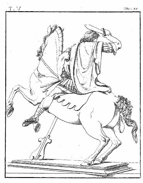 Cette figure curieuse servait à la décoration d'une fontaine, découverte dans les fouilles de Portici au mois de décembre 1754; elle tenait le milieu parmi dix autres plus petites, toutes servant au dégorgement des eaux. Le vieux Faune ou Silène, comme on voudra l'appeler, couronné de lierre, la barbe divisée en longues moustaches, est à cheval, d'un air très-sérieux, sur une outre qu'il tient par les oreilles, et dont la large bouche donnait passage à l'eau. Il se tient en bon écuyer, le corps droit et les jambes pendantes, approchant du ventre de sa monture, ses talons armés d'une chaussure grossière. Ces figures bachiques étaient souvent employées à répandre les eaux des fontaines. Le caprice de l'artiste en variait à son gré les intentions. Si l'on voulait supposer ici quelque intention allégorique, on pourrait rappeler le proverbe grec: «Le vin est un bon cheval pour qui a du chemin à faire»; mais il faudrait penser aussi que le bon Silène croit tenir entre les jambes une outre plus généreuse, et qui épanche autre chose que le trésor des nymphes.