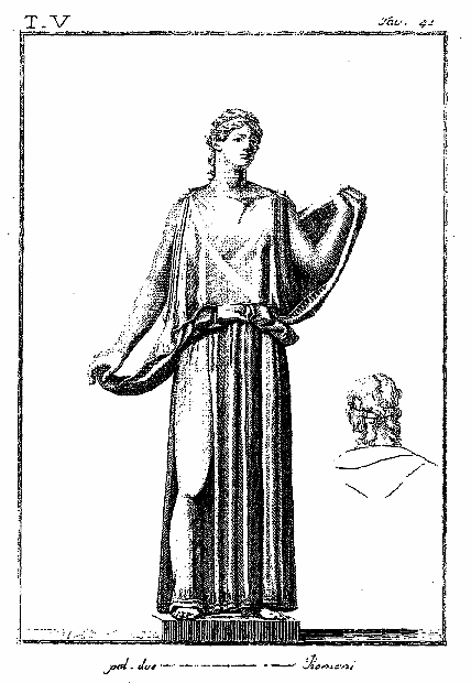 FIG. II. Pallas tenant une patère, et dans l'attitude de s'appuyer sur une lance qui manque. Ce bronze, d'un excellent travail, reçoit encore un nouveau prix de l'argent, habilement employé former les écailles de l'égide, les ornemens du cimier, les boutons de l'habit, l'anneau, les yeux, et les ongles des pieds et des mains. Les draperies, dont les plis sont de la plus grande élégance, se rapportent à la description que Pausanias fait de la statue de Pallas à Athènes. Cette Déesse prenait le nom de Pallas de ce qu'elle était sortie toute armée du cerveau de Jupiter: sous le nom de Minerve, c'était la fille de la Mémoire, l'intelligence suprême ou la sagesse, cette force secrète avec laquelle la nature agit d'elle-même et produit tout, suivant l'explication d'Athénagore (in Apolog. p. 209); c'est ce que signifiait cette inscription posée dans le temple de Saïs en Égypte, où elle était adorée: «Je suis tout ce qui fut, ce qui est, ce qui sera, et nul mortel n'a encore soulevé mon voile». (PLUT, De Is. et Os.).