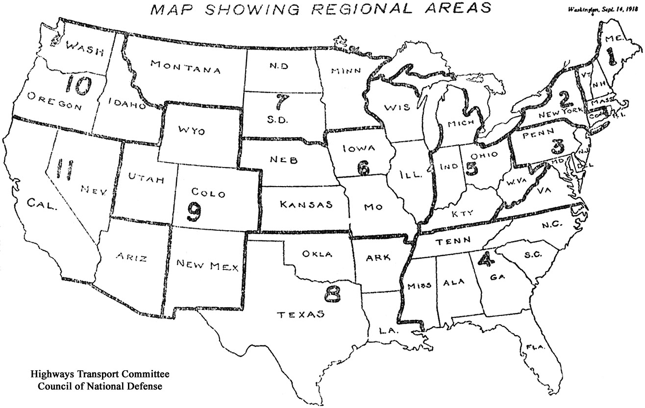National policies are directed from the headquarters of the national committee in Washington to the highways transport committees of the several State Councils of Defense. These State organizations, which by proper subdivisions reach down through the counties to the communities, are grouped together into 11 regional areas, as shown by the map used above. The State committees of the different areas are assisted by and are under the direct supervision of the 11 regional chairmen of the Highways Transport Committee, Council of National Defense.