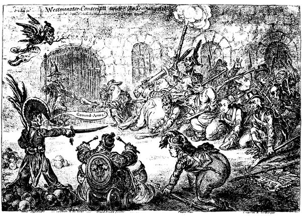 The cartoon entitled "Westminster Conscripts under the Training Act" appeared September 1, 1806. Napoleon, the drill sergeant, is elevated on a pile of cannon-balls; he is giving his authoritative order to "Ground arms." The invalided Fox has been wheeled to the ground in his armchair; the Prince of Wales' plume appears on the back of his seat. Other figures in the cartoon are Lord Lauderdale, Lord Grenville, Lord Howick, Lord Holland, Lord Robert Spencer, Lord Ellenborough, the Duke of Clarence, Lord Moira, Lord Chancellor Erskine, Colonel Hanger, and Talleyrand.