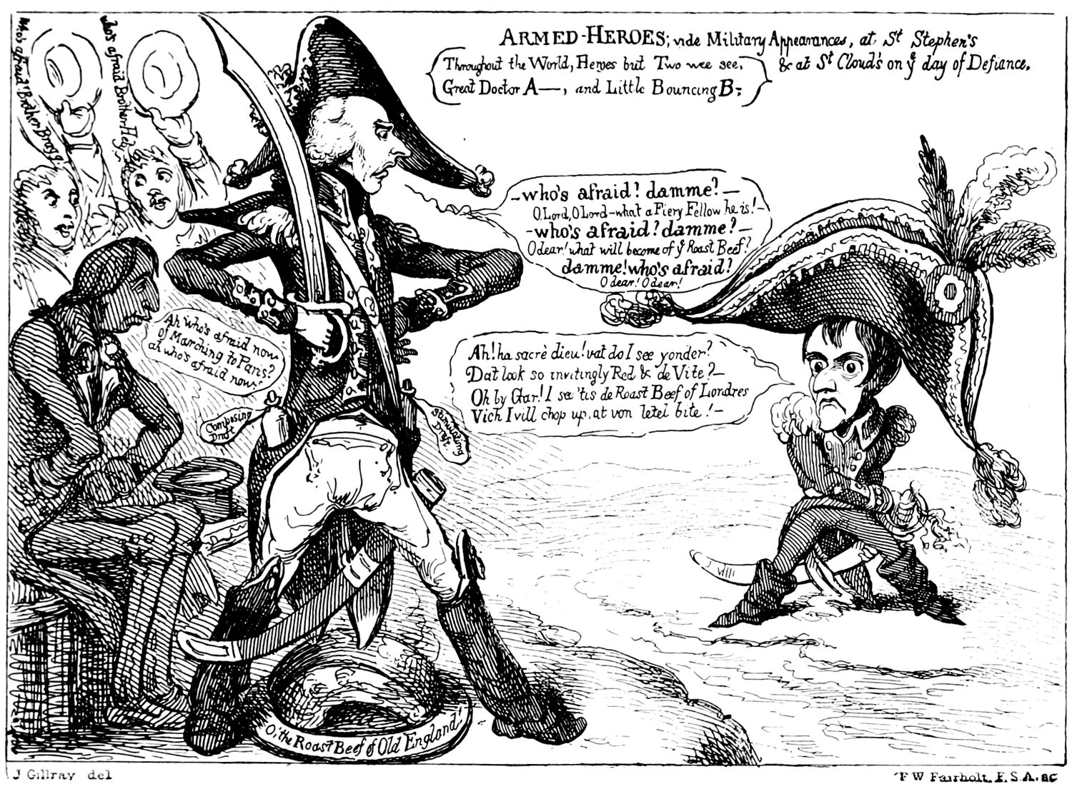 As Gillray retires from the field several other clever artists stand ready to take his place, and chief among them Rowlandson. The latter had a distinct advantage over Gillray in his superior artistic training. He was educated in the French (p. 48) schools, where he gave especial attention to studies from the nude. In the opinion of such capable judges as Reynolds, West, and Lawrence, his gifts might have won him a high place among English artists, if he had not turned, through sheer perversity, to satire and burlesque. Rowlandson's Napoleonic cartoons began in July, 1808. These initial efforts are neither especially characteristic nor especially clever, but they certainly were duly appreciated by the public. Joseph Grego, in his interesting and comprehensive work upon Rowlandson, says of them: