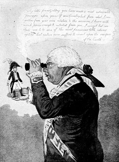 "You may have seen Gillray's famous print of him—in the old wig, in the stout, old, hideous Windsor uniform—as the King of Brobdingnag, peering at a little Gulliver, whom he holds up in his hand, whilst in the other he has an opera-glass, through which he surveys the pygmy? Our fathers chose to set up George as the type of a great king; and the little Gulliver was the great Napoleon."—Thackeray's "Four Georges".