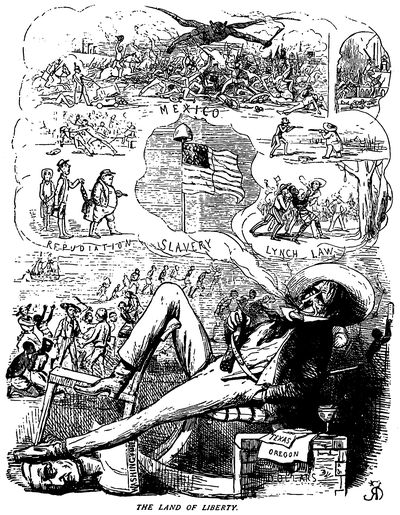 For the first decade of the nineteenth century there was but one important source of caricature, and one all-important subject—England and Bonaparte. America at this time counted for little in international politics. The revolutionary period closed definitely with the death of Washington, the one figure in our national politics who stood for something definite in the eyes of Europe. Our incipient naval war with France, which for a moment threatened to assign us a part in the general struggle of the Powers, was amicably concluded before the close of the eighteenth century. Throughout the Jeffersonian period, national and local satire and burlesque flourished, atoning in quantity for what it lacked in wit and artistic skill. Mr. Parton, in his "Caricature and Other Comic Art," finds but one cartoon which he thinks it worth while to cite—Jefferson kneeling before a pillar labeled "Altar of Gallic Despotism," upon which are Paine's "Age of Reason," and the works of Rousseau, Voltaire, and Helvetius, with the demon of the French Revolution crouching behind it, and the American Eagle soaring to the sky bearing away the Constitution and the independence of the United States, and he adds: "Pictures of that nature, of great size, crowded with objects, emblems, and sentences—an elaborate blending of burlesque, allegory, and enigma—were so much valued by that generation that some of them were engraved upon copper."