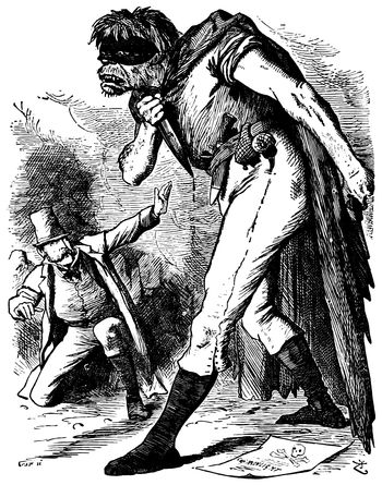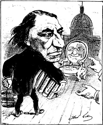 While the impulse to satirize public men in picture is probably as old as satiric verse, if not older, the political cartoon, as an effective agent in molding public opinion, is essentially a product of modern conditions and methods. As with the campaign song, its success depends upon its timeliness, upon the ability to seize upon a critical moment, a burning question of the hour, and anticipate the outcome while public excitement is still at a white heat. But unlike satiric verse, it is dependent upon ink and paper. It cannot be transmitted orally. The doggerel verses of the Roman legions passed from camp to camp with the mysterious swiftness of an epidemic, and found their way even into the sober history of Suetonius. The topical songs and parodies of the Middle Ages migrated from town to town with the strolling minstrels, as readily as did the cycles of heroic poetry. But with caricature the case was very different. It may be that the man of the Stone Age, whom Mr. Opper has lately utilized so cleverly in a series of caricatures, (p. 2) was the first to draw rude and distorted likenesses of some unpopular chieftain, just as the Roman soldier of 79 A. D. scratched on the wall of his barracks in Pompeii an unflattering portrait of some martinet centurion which the ashes of Vesuvius have preserved until to-day. It is certain that the Greeks and Romans appreciated the power of ridicule latent in satiric pictures; but until the era of the printing press, the caricaturist was as one crying in a wilderness. And it is only with the modern co-operation of printing and photography that caricature has come into its full inheritance. The best and most telling cartoons are those which do not merely reflect current public opinion, but guide it. In looking back over a century of caricature, we are apt to overlook this distinction. A cartoon which cleverly illustrates some important historical event, and throws light upon the contemporary attitude of the public, is equally interesting to-day, whether it anticipated the event or was published a month afterward. But in order to influence public opinion, caricature must contain a certain element of prophecy. It must suggest a danger or point an interrogation. As an example, we may compare two famous cartoons by the English artist Gillray, "A Connoisseur Examining a Cooper" and the "King of Brobdingnag and Gulliver." In the latter, George III., in the guise of a giant, is curiously examining through his magnifying glass a Lilliputian Napoleon. There is no element of prophecy about the cartoon. It simply reflects the contemptuous attitude of the time toward Napoleon, and underestimates the danger. The other cartoon, which appeared several years earlier, shows the King anxiously examining the features of Cooper's well-known miniature of Cromwell, the great overthrower of kings. Public sentiment at that time suggested the imminence of another revolution, (p. 4) and the cartoon suggests a momentous question: "Will the fate of Charles I. be repeated?" In the light of history, the Gulliver cartoon is to-day undoubtedly the more interesting, but at the time of its appearance it could not have produced anything approaching the sensation of that of "a Connoisseur."
