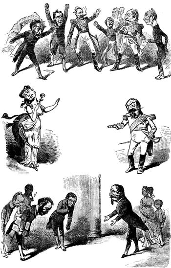"It is certain that the caricaturist's travesties of the little Emperor, his burlesques of his great actions and grandiose declarations, his figurative displays of the mean origin of the (p. 49) imperial family, with the cowardice and depravity of its members, won popular applause ... And when disasters began to cloud the career of Napoleon, as army after army melted away, ... the artist bent his skill to interpret the delight of the public. The City competed with the West End in buying every caricature, in loyal contest to prove their national enmity for Bonaparte. In too many cases, the incentive was to gratify the hatred of the Corsican rather than any remarkable merit that could be discovered in the caricatures. Very few of these mock-heroic sallies imprint themselves upon (p. 50) the recollection by sheer force of their own brilliancy, as was the case with Gillray, and frequently with John Tenniel. Rowlandson and Cruikshank are risible, but not inspired."