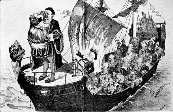 Gillray has left a cartoon commemorating the arrival of the Danish squadron, under the title of "British Tars Towing the Danish Fleet into Harbor; the Broad Bottom (p. 43) Leviathan trying to swamp Billy's Old Boat; and the Little Corsican Tottering on the Clouds of Ambition." This cartoon was issued October 1, 1807. Lords Liverpool and Castlereagh are lustily rowing the Billy Pitt; Canning, seated in the stern, is towing the captured fleet into Sheerness, with the Union Jack flying over the forts. Copenhagen, smoking from the recent bombardment, may be distinguished in the distance. In Sheerness harbor the sign of "Good Old George" is hung out at John Bull's Tavern; John Bull is seated at the door, a pot of porter in his hand, waving his hat and shouting: "Rule Britannia! Britannia Rules the Waves!" That the expedition did not escape censure is shown by the figure of a three-headed porpoise which is savagely assailing the successful crew. This monster bears the heads of Lord Howick, shouting "Detraction!" Lord St. Vincent tilled with "Envy," and discharging a watery broadside; and Lord Grenville, who is raising his "Opposition Clamor" to confuse their course.