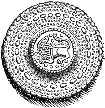 Fig. 10.—Head of a Pin found in London. Now in the British Museum. A little less than full size. The subject seems to represent Constantine’s vision of the Cross 24