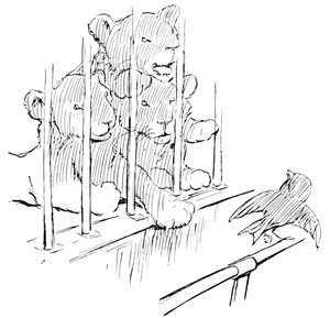 "I would have been here sooner," answered the sparrow, "but I found it necessary to give one of those young lions a lesson. He forgot about the Law, and tried to catch me in his mouth. But I was too quick for him. You should have seen me then. I flew at his eyes and gave them a good pecking. [Pg 13]Then I had to go and tell his mother. Didn't you hear her roaring at the little upstart to behave himself? Oh, you can trust me to educate those young lions in the Law."