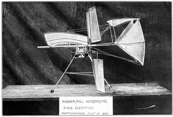 It is to be remembered that the mechanical difficulties of artificial flight have been so great that, so far as is known, never at any time in the history of the world previous to my experiment of May, 1896, had any such mechanism, however actuated, sustained itself in the air for more than a few seconds—never, for instance, a single half-minute—and those models which had sustained themselves for these few seconds, had been in almost every case actuated by rubber springs, and had been of such a size that they should hardly be described as more than toys. This refers to actual flights in free air, unguided by any track or arm, for, since the most economical flight must always be a horizontal one in a straight line,5 the fact that a machine has lifted itself while pressed upward against an overhead track which compels the aerodrome to move horizontally and at the proper angle for equilibrium, is no proof at all of real “flight.”