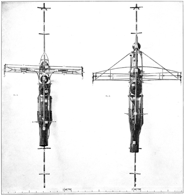 Although Pénaud recognized that, theoretically, two screws are necessary in an aerial propeller, as the use of a single one tends to make the apparatus revolve on itself, he adopted the single screw on account of the greater simplicity of construction that it permitted. One of these little machines is shown as No. 11, Plates 1 and 2.