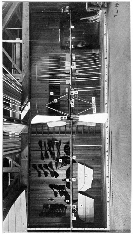 The motive power is a twisted hank of fine rubber strips, which weighs 5 grammes out of a total of 16 grammes for the whole machine, whose center of gravity should be in advance of the center of surface CD, as will be demonstrated in another place. This device attracted little notice, and I was unfamiliar with it when I began my own first constructions at Allegheny, in 1887.