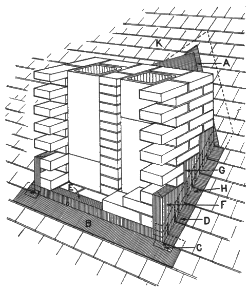HE prime function of a chimney is to produce a draft that will cause sufficient combustion and carry off the resulting smoke; incidentally it assists ventilation. Many unsatisfactory heating plants and much excessive fuel consumption are due to improperly constructed chimneys, which are the rule rather than the exception. Although many of these are more inefficient than dangerous, yet reports of the National Board of Fire Underwriters[1] show that a larger number of fires are caused by defective chimney construction than by anything else. The annual loss resulting from such fires is greater than the fire loss from any other cause. Poor chimney construction is responsible for smoke pollution of the air, waste of fuel, and poor heating.
