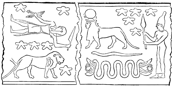 This is quite true, for the Greek name for the Sign was Chelai, which means simply the Claws. And thus the Scorpion monopolised two Signs; its body one, and its claws the other. This led to the mistake of Servius, the intelligent commentator on Virgil,94 that “the Chaldean Zodiac consisted of but eleven constellations.” We now know that there were twelve Signs, and the mistake is thus explained.