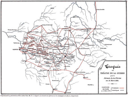 In the matter of maps, the very complete apparatus of maps in Mr. Whitehead’s Gaspard de Coligny, Admiral of France, has greatly lightened my task, and I express my cordial thanks to Mr. Whitehead and Messrs. Methuen & Co., his publishers, for permission to reproduce those in that work. My thanks are also due to M. Ch. de Coynart and MM. Firmin Didot et Cie for permission to reproduce the map illustrating the battle of Dreux from the late Commandant de Coynart’s work entitled L’Année 1562 et la bataille de Dreux; and to M. Steph. C. Gigon, author of La bataille de Jarnac et la campagne de 1569 en Angoumois, for[xii] permission to use his two charts of the battle of Jarnac. Those illustrating the Tour of the Provinces in 1564-66, the march of the duke of Alva and Montgomery’s great raid in Gascony are my own. Some lesser maps and illustrations are from old prints which I have gathered together, in the course of years, except that illustrating the siege of Havre-de-Grace and the large picture of the battle of St. Denis, which have been photographed from the originals in the Record Office.