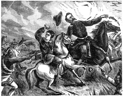 "Glory! kin I b'lieve my eyes? A hull army o' 'em, az I'm a sinner. Ther report I heerd must be true then. My yallar-haired chief air on the war-trail, and when Custer gits on ther rampage thar's blood on ther moon."