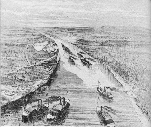 Commodore Foote’s gunboats ascending the Tennessee to attack Fort Henry.