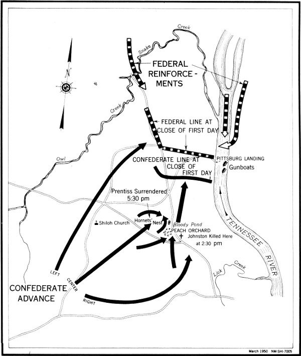 SHILOH NATIONAL MILITARY PARK preserves the scene of the first great battle in the West of the War Between the States. In this 2-day battle, April 6 and 7, 1862, both the Union and Confederate Armies suffered heavy casualties, bringing home the horrors of war to the North and South alike. Nearly 24,000 were killed, wounded, or reported missing—a number equal to more than one-fifth of the combined Union and Confederate Armies engaged in the battle. By their failure to destroy the Federal Armies at Shiloh the Confederates were forced to return to Corinth, Miss., relinquishing all hold upon West Tennessee, except a few forts on the Mississippi which were soon to be wrested from them. Their failure at Shiloh foreshadowed the loss of the Memphis and Charleston Railroad, the South’s vital line of communication between Chattanooga and the Mississippi. After the fall of Memphis, early in June, the Federals were in position to strike at Vicksburg, the conquest of which would give them control of the Mississippi and split the Confederacy in two.
