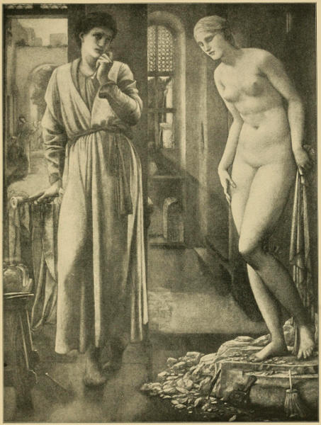 "The four pictures from 'The Story of Pygmalion,'" he writes, "also included in The Earthly Paradise, again show this preference of the poet and the artist for the spirit before the form, provided only the last be beautiful. The first, 'The Heart Desires,' is the idealization of unsatisfied longing for the unknown. Pygmalion, a tall, dark-haired young man, in a long garment falling in straight folds to his feet, stands brooding on life's emptiness in the vestibule of his house. A sculptured group of the Three Graces denotes his profession and at the same time typifies the cold beauty of artifice, the beauty of the mind, while two girls, seen through the open door, speeding along the street in the artless embrace of innocent maidenhood, represent the beauty of the body and the love that waits his winning; but in neither finds he consolation. In the second, 'The Hand Refrains,' the days of long labor are ended, and the artist's ideal, the cold, pure figure of the yet soulless image stands finished on the still rough pedestal, surrounded by flakes and chips of marble and implements of the sculptor's craft, while Pygmalion, chisel and mallet in hand, stays gazing in awe at the marvel his hand has achieved, his eyes content, but his soul still hungering. Outside the window behind him women go about their daily business in the city street, and through another casement, in a recess between him and the image, is a glimpse of a garden and a spurt of water falling into a marble basin—the constant dropping that wears away the stone, as his constant prayers shall move the goddess Venus to a miracle on his behalf. The third bears the motto, 'The Godhead Fires.' Into the sculptor's chamber, silent and solitary, while Pygmalion is away in the temple, floats lightly the Queen of Love, clad in a soft, transparent robe, flower-crowned and bearing a branch of myrtle, emblem of marriage rites, her feet brushed and environed by the white wings of her favorite doves. Towards her, leaning both arms on one uplifted from the goddess's side, an exquisite piece of composition, the awakening image stoops from the carved capital, blossom-strewn by the adoring Pygmalion, her eyes raised in awe up to the goddess, who with fixed gaze and pointed finger inspires her with the Promethean fire of life. Lastly, 'The Soul Attains.' Heart and soul are alike satisfied. Pygmalion kneels, looking up in trembling worship at the beautiful creature who lingeringly yields him her hands, though she still gazes out beyond him in dumb amazement at the mystery of consciousness that has suddenly been born in her. Marble no longer, but not yet altogether woman."