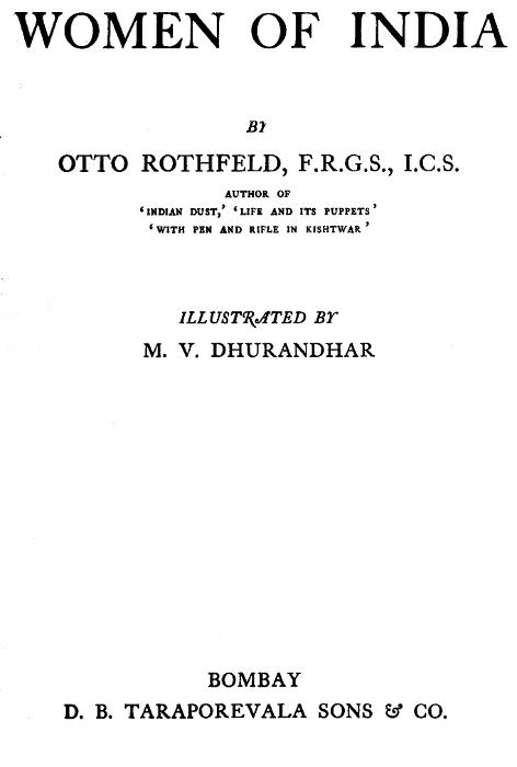 The Project Gutenberg EBook of Women of India, by Otto Rothfeld This eBook is for the use of anyone anywhere in the United States and most other parts of the world at no cost and with almost no restrictions whatsoever. You may copy it, give it away or re-use it under the terms of the Project Gutenberg License included with this eBook or online at www.gutenberg.org. If you are not located in the United States, you'll have to check the laws of the country where you are located before using this ebook. Title: Women of India Author: Otto Rothfeld Illustrator: M. V. Dhurandhar Release Date: October 30, 2015 [EBook #50346] Language: English Character set encoding: UTF-8 *** START OF THIS PROJECT GUTENBERG EBOOK WOMEN OF INDIA *** Produced by Julie Barkley and the Online Distributed Proofreading Team at http://www.pgdp.net
