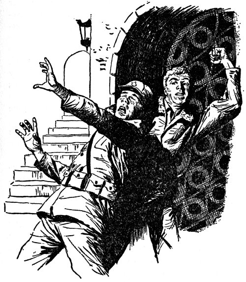 Biff waited. He counted slowly to a hundred, to make sure his strange visitor was gone. Once more he looked out the window. Nothing moved in the eerie light of the dawn. Biff turned away. Had he waited a few seconds longer, he would have seen two men leave the shadows of a corner tree and stealthily follow the hurler of the object.