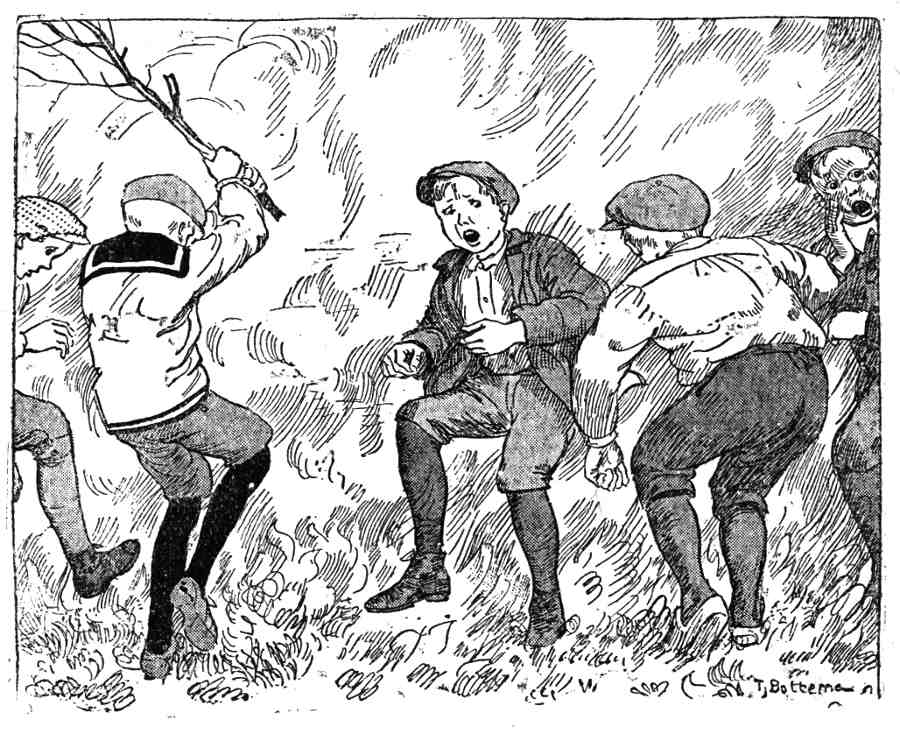 'n Paar jongens begonnen te lachen. Ze herinnerden zich de historie nog, van verleden jaar. Ze hadden staan knikkeren. Theo leunde tegen den muur. Hij wou zuinig wezen op zijn nieuwe pak, dat hij voor 't eerst aanhad. Boven zijn hoofd waren de jonge zwaluwen aan het babbelen. En toen hij opkeek, daalde er juist wat van boven neer, dat hem een mooie medaille gaf op zijn linkerborst. Ze zagen hem nog staan kijken; eerst onbeholpen. Toen had hij ineens dien sulligen Henk Staden aangeklampt.
