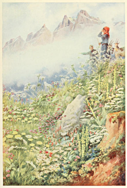 Les Plans lies snug upon a verdant, watered plateau surrounded on all sides but one by lofty mountains. To the west rises the steep glacier of Plan Névé and the massive form of the Grand Muveran, beloved of Eugène Rambert, famous alpinist-author-botanist, whose name, together with those of Juste Olivier and Jean Muret, is graven upon the Muveran’s[21] sheer precipice at romantic Pont de Nant. At this latter place—only a brief walk from Les Plans—there is a most interesting Alpine garden belonging to the University of Lausanne; it is especially charming in spring, with floral gems of purest hues backed by the translucent ice and snow of the Glacier de Martinet and the Dent de Morcles.