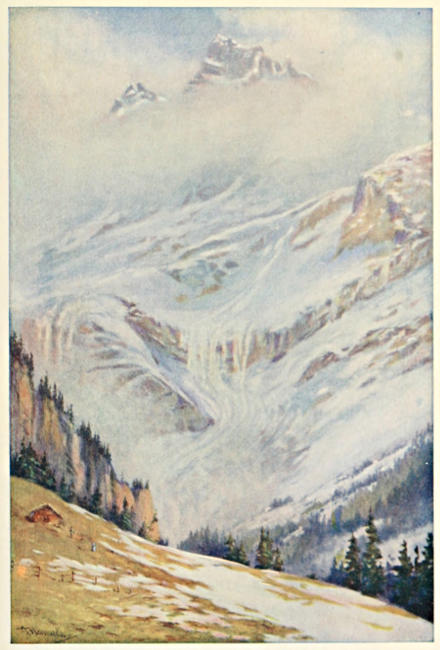 As one emerges from the timbered gorge, one is confronted at once by the jagged mountains of the chain of the Grand Muveran; not as they appear in summer, with bare, forbidding precipice and scree, but as they can appear in springtime only, clothed about in winter’s dissipating snows and gladdened by an immediate foreground of glistening crocuses on the brown orchard slopes of Frenière. At this point, looking back, one has a splendid view of the giant hill that carries Villars upon its breast; but the village that one sees with its old church tower clinging to the side at a height of 1133 metres, and seemingly in difficulty to restrain itself from slipping into the gulf, is Gryon, where Juste Olivier, one of Switzerland’s most tuneful poets, spent his last years and sang imperishable songs—songs that have found a place in the heart and life of the people, particularly when the theme is the mi-été festivities at Anzeindaz and Taveyannaz. These midsummer fêtes are held annually in connection with the cattle and cheese industry: they are delightfully[20] typical of old-world custom, and the poet has done much to render them impervious to the destructive note of modern sophistication. Both pasturages lie on the mountains between Villars and Les Plans, and are easy excursions from either of these places and from Gryon. Anzeindaz is the more wild and romantic of the two, its surroundings lending themselves admirably to these picturesque timeworn merrymakings; for the pasturage lies at the foot of the rugged Diablerets, at the foot, too, of a glacier, and at the base of a wild col which, although this is a closed district against hunters, is a spot that knows well the poachers of eagles. There can be little doubt of which way Juste Olivier would cast his vote with regard to the railway that it is proposed shall desecrate these fascinating wilds, dissipating their guileless, primitive associations. He would be on the side of the angels; and the angels are on the side of the Heimatschutz or League for the Preservation of Natural Beauty.