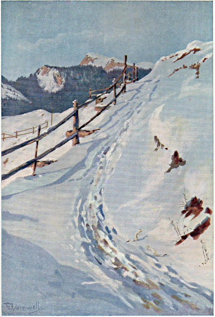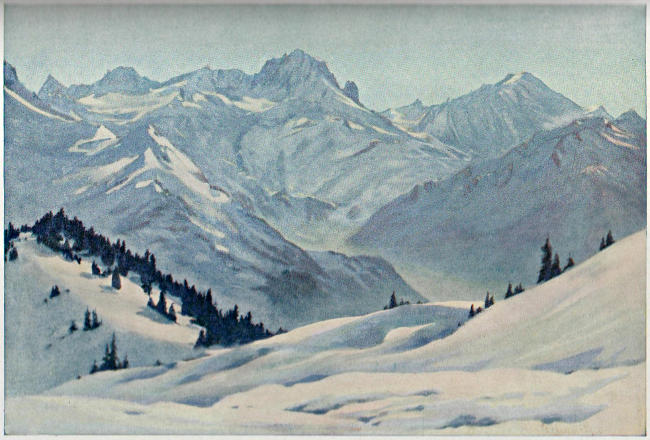 “But I must not keep you too long with the fantastic, for already your train is passing Gryon, built like a bird’s nest in the hill, and soon Villars itself is reached. There get out, and having drunken of the panoramic ecstasy from the Diablerets round to the mountains of Savoy, walk down the road towards Chesières, snugly sleeping a hundred feet below Les Ecovets. You must not go as far as Chesières however, for having crossed the viaduct over the deep ravine a little beyond Villars I want you to turn round quickly and tell me your candid opinion of the picture—as soon as you can get your breath. For here, surely, if ever you are[24] sensitive to your environment, Beauty will take you to her breast. The clustering fir trees, framed about with velvet plots of green under a clear, blue-grey sky; the suggestion of the infinite in the peaks tossing in the heat-haze like a wild sea beyond the verge of a far-away coast; the chastening awe of the Glacier of Trient and the undertone of the gorge-water below rising like the spirit of reflection bred of the dense solitude of hill and sky—all these fine miracles about you! For this is the charm of Villars, that it lies a kind of lagoon of quiet beauty amid the circling terror of pitiless frost and snow. ‘Domestic felicity’ best describes the atmosphere of this little hill-town, the wrath and terror of rock and glacier mellowed by distance and yet near enough to heighten by contrast the soft rapture of Villars reposing in the arms of its hills. Go up another day to Les Ecovets, and, looking across to Leysin and the Tours d’Aï and away to Lac Léman and the dim-blue Jura mountains, say if ever ruler of the world claimed more glittering conquest than this of yours. For whether you are mountaineer or one of the people who ‘never walk’, the groves of Les Ecovets will always lure you. Painter, poet, rhapsodist or mere plain, blunt man, you there will find inspiration such as is not written in any book. It must indeed have been at Les Ecovets that the little English child,[25] waking suddenly from a noonday sleep, wished that he were always ‘with Christmas’; for the magic of all pines that ever mimicked an Alpine glade on paper, the glamour of all the berries that made your long-ago December a lustrous time in hearth and hall, and the mystery of all Christmas memories of other climes is here consummated in Nature’s own most ideal, most artistic scheme. I know no place like Villars for health and holiness: the high health of crystal air and shining peak, the strange holiness of solitude and the silent eloquence of the sky-embracing mountains; for there in the palpable hush are the mystic pipes of Pan that charm us on with tunes played ‘not to the sensual ear’ but are ever making for the spirit ‘ditties of no tone’.”