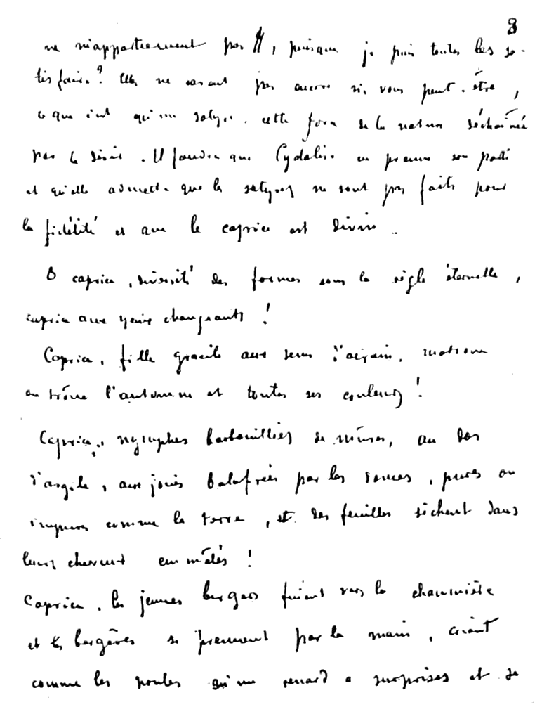 Ne vous représentez pas la Grèce antique comme un pays à bonnes fortunes. L'amour n'y était estimé que sous une forme qui me répugna toujours. Peu de joies: une esclave échappée, une paysanne en rut. Si je n'avais eu les nymphes, mes sœurs, je serais mort d'ennui; mais les nymphes sont moins variées que les femmes, quoique plus jolies, et leur orgueil est terrible. L'enseignement dégoûtant d'un certain Socrate, apôtre bigarré de la pédérastie et de la vertu, ennemi des femmes et des dieux, hâta ma fuite. Je passai en Italie, où je retrouvai un certain état de nature et des mœurs humaines. Pour n'étonner personne, je m'appelai Faune, comme mes frères italiques.