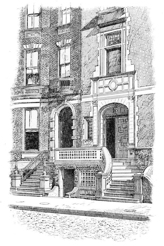 Thus far we have been speaking of the respectable and conservative element in the new departure, of the Extreme Right, so to speak, and generally of works which were seriously designed, and so are entitled to be seriously considered. It is not so pleasant to turn to the Extreme Left, a frantic and vociferous mob, who welcome the “new departure” as the disestablishment of all standards, whether of authority or of reason, and as an emancipation from all restraints, even those of public decency, and who avail themselves of the remission of them from academic restraints to those imposed by their own sense of propriety by promptly showing that they haven’t any. The tame decorum of one phase of the new departure is supplemented by the violent indecorum of another. Sometimes the same designers march now with one wing and now with the other of the divergent host. Messrs. McKim, Mead, & White, for example, have consoled themselves for what now almost seems to have been the enforced sedateness of the houses we have noticed, by a mad orgy of bad architecture in East Fifty-fifth Street. The scene of this excess almost immediately adjoins the dignified and respectable dwelling designed by Mr. Haight, and almost frights that edifice from its propriety, and the designers seem to have been led into it by the baleful example of older persons who ought to have known better, and who committed the maddest freaks in the artistic quarter of the London suburb of Chelsea while in a condition of total irresponsibility alike to any con{32}victions and to any conventions of architectural art. The present indecorum has been committed in the design of two dwellings which consist of a ferociously rugged basement and parapeted cornice in granite, with two or three irregularly disposed tin dormers emerging above, and with a flat and shallow screen of brick wall inserted between them, as between the upper and the nether millstone, and having its thinness emphasized at all the angles by shallow incisions forming a series of brick weather-strips, as it were, a square reticulation of which traverses the plane surfaces also. It is quite conceivable that rugged simplicity may have suggested itself to a designer as a desirable character for a city house, but it seems scarcely possible that squareness and flatness and thinness should have appeared desirable, and quite impossible that beauty should have seemed to dwell in a building the top and bottom of which were characterized by rugged simplicity, and the middle by squareness and flatness and thinness. The details, whether in brick or granite or tin, are as preposterous as the conception of a building with its parts thus swearing at each other. The round-headed doorway is surmounted with the imitation in granite of a metal flap secured to the rest of the block from which it is cut by similitudes in granite of iron bolt-heads. In the basement respectable blocks of granite are subjected to the indignity of being decorated with streaming ribbons in low-relief. In truth, the only detail of the work which one can contemplate even with tolerance is a grill in the basement doorway which is the simplest possible trellis of iron rods.