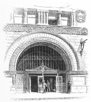 It is strange to see so thoroughly studied a performance as this succeeded by so thoroughly unstudied a performance as the Mills Building, by the same architect. But possibly ten-story buildings, which must be built in a year, will not wait for architects to mature designs which would make the buildings of interest to students of architecture as well as to investors. Whatever the cause may be, the result is unfortunate; for after the grandiose and somewhat swaggering Roman gateway, and the portcullis which it encloses, have been taken out, the rest of the Mills Building may safely be thrown away. The portcullis is really an interesting piece of iron-work both in design and in workmanship, although in both it is distinctly inferior to such a piece of work as the nondescript beast in cast iron that performs the humble office of holding a sign in Cedar Street, and that might have been wrought in the thirteenth century, so grotesque, so skilful, so charged{49} with the spirit of artistic and enjoyed handicraft it is. [See initial letter.]
