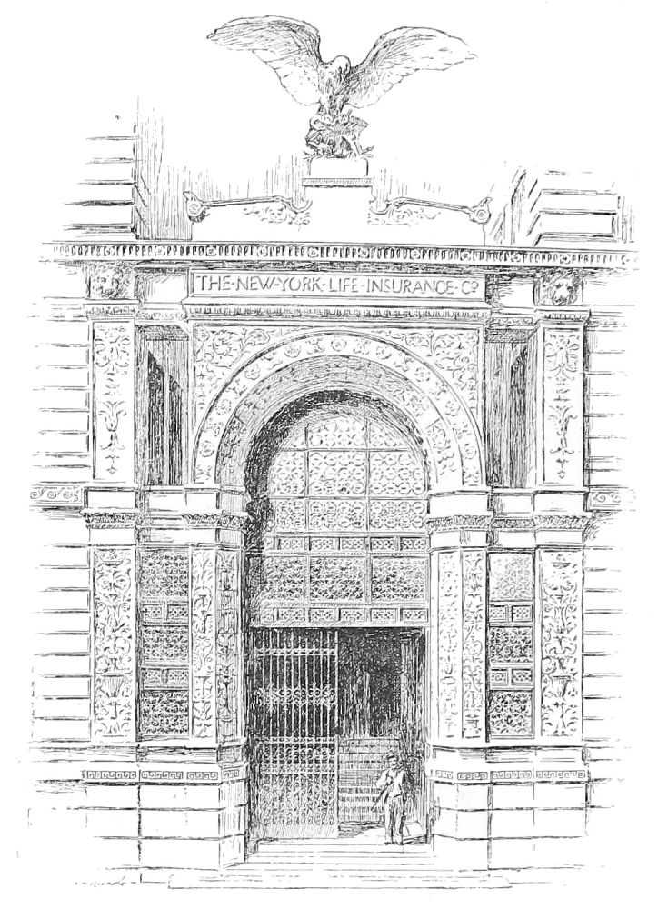 Another commercial building, at the corner of Broadway and Wall Street, is by the architects of the Union League Club, and seems to have been designed under the pressure of a recent discovery that that building would not do. There is no doubt about the discovery; it is only a pity that it should not have been made from the drawings before they were translated into masonry. Clear, however, as the architects were on this point, they were not so clear when they began the United Bank Building what would do, and the first two stories look like a series of tentative experiments to find out. They were proving all things, perhaps, with the intention of holding fast that which was good. The practice of projecting bowlders, especially in soft sandstone, has already been mentioned as a somewhat slovenly substitute for the expression of vigor by modelling. Bowlders are projected from the piers of this basement in the most ferocious and blood-curdling manner—so ferocious, indeed, that the architects repented them of their bullying behavior. It is like the fear that came upon Snug the joiner, of the consequences that would ensue if ladies took him for the king of beasts: “Another prologue must tell he is not a lion.” And so the architects seem to have taken the counsel of Nick Bottom: “Half his face must be seen through the lion’s neck;{44}