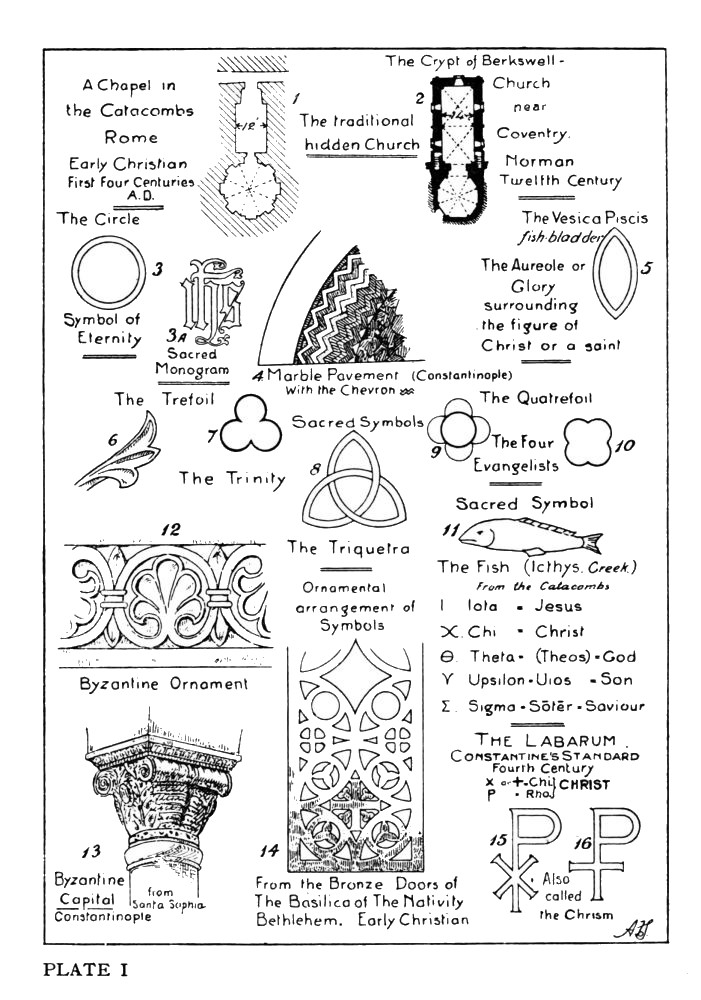 THE term Gothic was applied originally as one of contempt in the fifteenth century by the architects of the Renaissance, who attempted to reproduce the ancient architecture of Rome, and considered Mediæval Art, which had ruled all departments of design throughout Europe during the three preceding centuries, to be no better than the invention of the Barbarians, the Goths, and the Vandals, who overran the Roman Empire in the fourth century. During the three previous centuries the persecuted converts to Christianity were driven to take refuge in any hiding-place available. In Rome they descended to the Catacombs, the underground workings of the ancient Roman stone quarries, consisting of narrow,{16} low passages, their aggregate lengths amounting to hundreds of miles. There they quarried out of the rock their chambers for assembly, where they gathered for worship in the light of torches or lamps, and excavated recesses for the burial of their dead. These chambers were imitated in the form of the Crypts (hidden chambers) existing under some churches and cathedrals. (Compare Plate I., Figs. 1 and 2.) The walls of the catacombs have rude incised inscriptions and carvings revealing the Christian Faith by symbols, such as the cross, suggesting the Crucifixion—the emblem of sacrifice; the circle, the line without end, the symbol of Eternity (Plate I., Fig. 3); the triangle, trefoil, and triquetra, symbols of the Trinity (Figs. 6, 7, and 8); the quatrefoil of the four evangelists (Figs. 9 and 10). The fish was adopted as a symbol of the Redeemer, because the letters of the Greek word icthys, when used as an acrostic, gave the initials of the words—Jesus, Christ, God, Son, Saviour (Plate I., Fig. 11). This symbol was extensively adopted in the decoration of baptismal fonts.