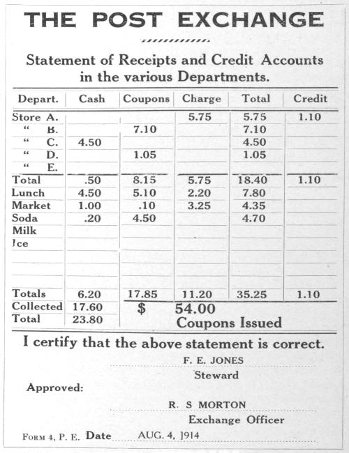 Our Post Exchanges are usually in charge of officers with little or no experience in book-keeping, their assistants are usually enlisted men and not professional clerks and accountants, and there is, at present, no codified or standard system prescribed for handling this business. Some parts of the Post Exchange Regulations have become antiquated through the developments of modern business methods such as the “Voucher Check System”.