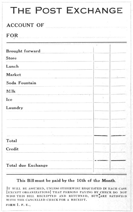 It is desired to give credit to Captain Henry M. Dichmann 24th Infantry, who by his work in connection with the Post Exchange at Fort Slocum, N. Y., was the inspiration for this work, and to Mr. James Parker, Cashier of the same Exchange, for valuable assistance rendered.